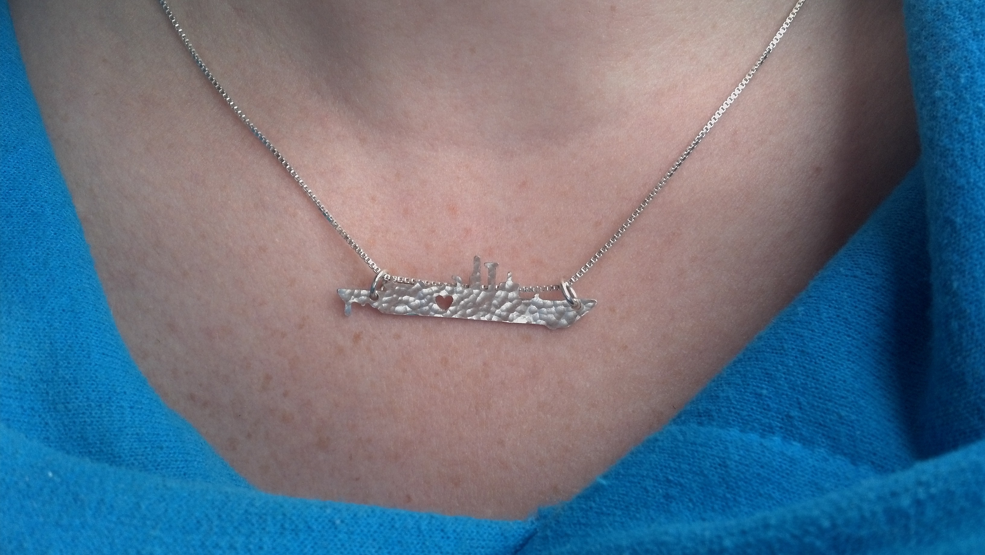 One day I was on Pinterest, and saw the state necklaces with the hearts in them. I got to thinking, since my heart doesn’t lie in any one state (we’ve lived in 3, in the past 3 years) what if I could get one of his ship with a heart in it?! What a great idea, the only problem was, who makes such a thing? At first I thought, “I could just make it myself!” Haha! Not the case, I don’t have the skills or the equipment to make something so delicate and beautiful. So my search was on.